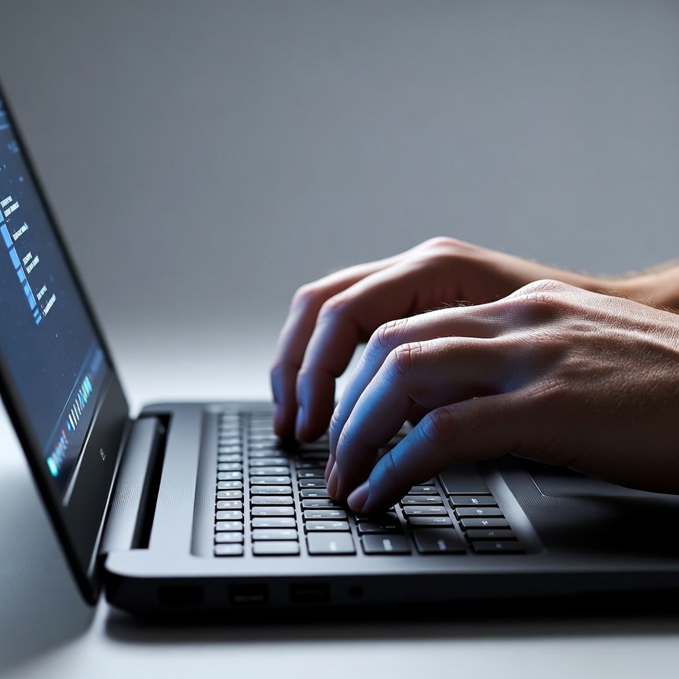 A pair of hands is typing on the keyboard of a black laptop. The screen displays open windows with a dark theme. The setup is on a plain dark background with soft lighting highlighting the hands and keys.