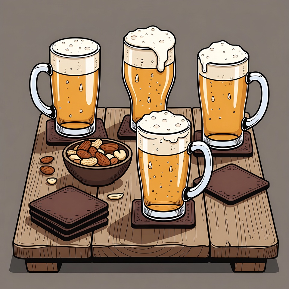 An illustration shows four tall glasses of frothy beer arranged on a wooden table with brown coasters. A small bowl of peanuts sits in the center among scattered nuts. The scene features a simple, isolated background in a cartoon style.