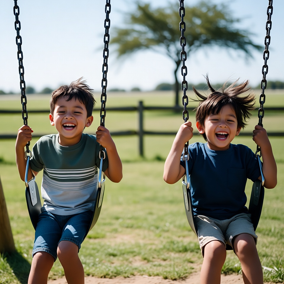 Two young boys with dark hair laugh joyfully while swinging high on metal swings with chains. They wear striped t-shirts and shorts, set against a sunny green field with a wooden fence and tree in the background. Their hair blows back from the motion of swinging.