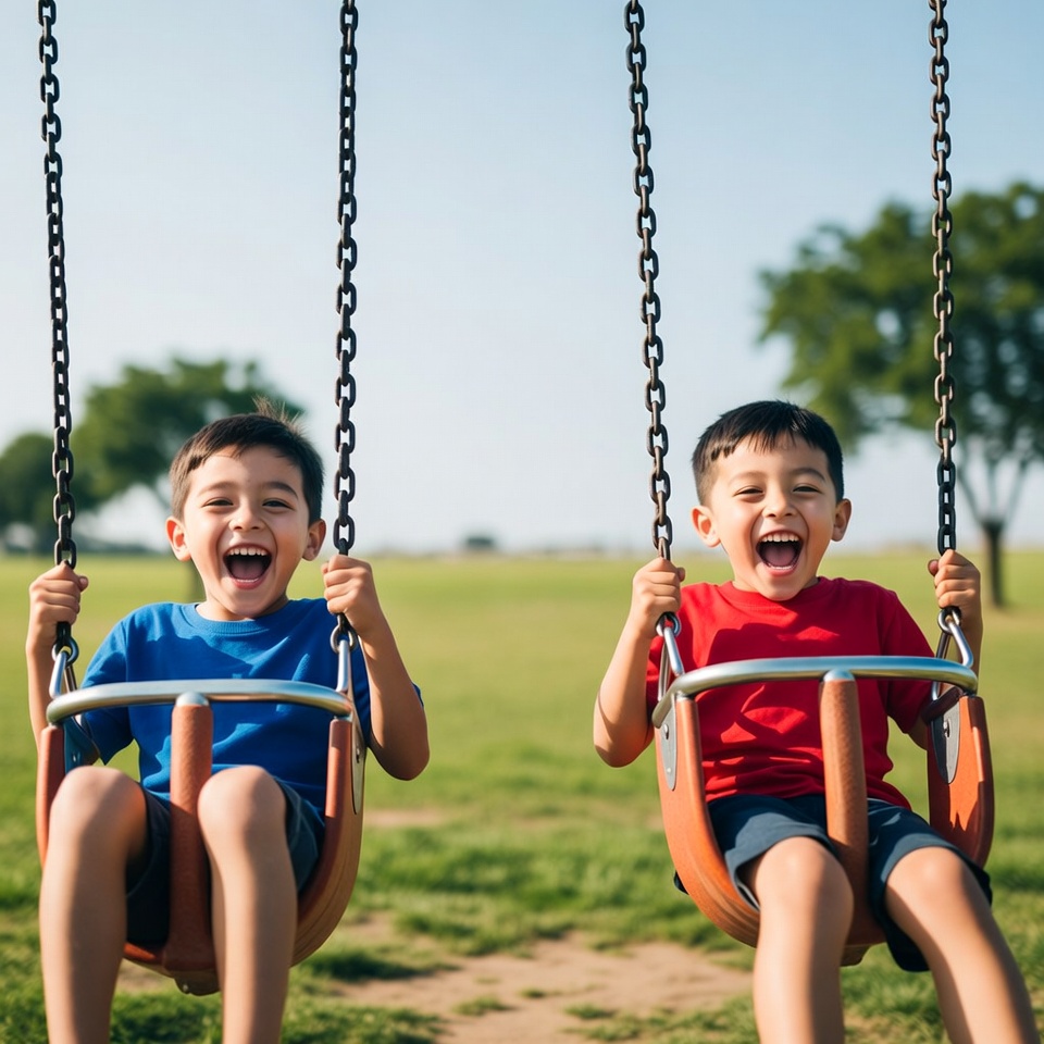 Two young boys with short dark hair sit on adjacent swings in a grassy park under a clear blue sky. The boy on the left wears a blue t-shirt and shorts, while the one on the right wears a red t-shirt and shorts. Both boys smile widely with excitement, holding onto the swing chains as trees appear in the background.
