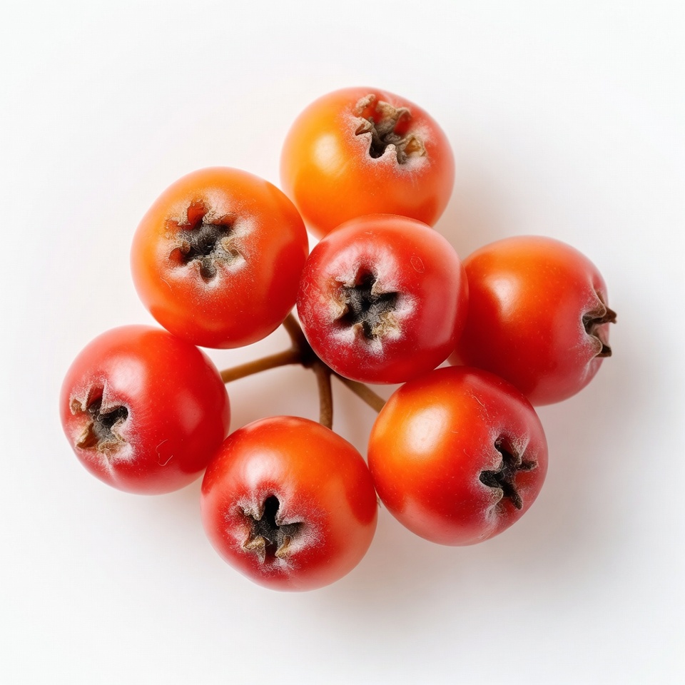 A cluster of vibrant red rowan berries with star-shaped brown seeds hangs from thin stems. The berries are arranged in a circular pattern on a plain white background. Each berry shows a slight powdery bloom on its surface.