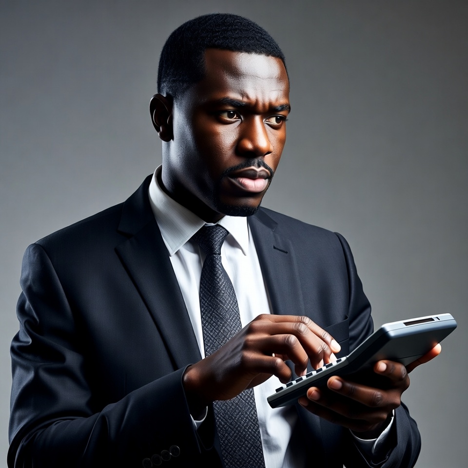 A young African-American man in a dark suit, white shirt, and black tie stands against a gray background. He holds a handheld calculator with both hands and presses the buttons intently. His expression shows concentration with furrowed brows.