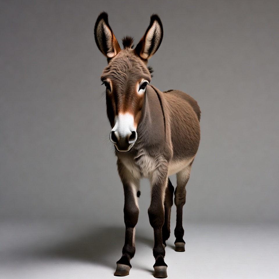 animal, brown donkey, burro, cute animal, dark eyes, equine, farm animal, furry ears, gray background, hooves, isolated, long ears, standing donkey, white muzzle, donkey