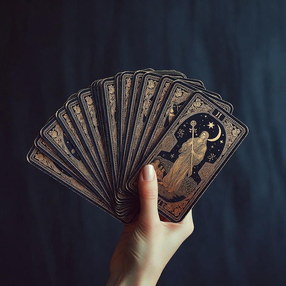 High Priestess, astrology, black background, crescent moon, dark backdrop, deck, divination, esoteric, fanned cards, female hand, fortune telling, gold cards, hand, illustration, magic, mystic, occult, oracle cards, ornate design, spirituality, spread, staff, stars, woman figure, tarot cards