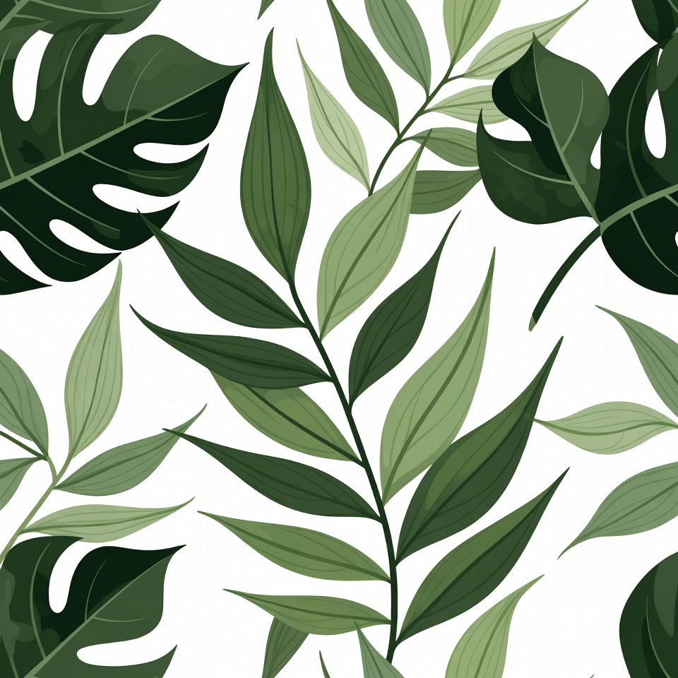 A seamless pattern features various green monstera leaves and tropical foliage scattered across a white background. The leaves display vibrant shades of green with detailed veins and splits. The design repeats continuously for use as wallpaper or fabric.
