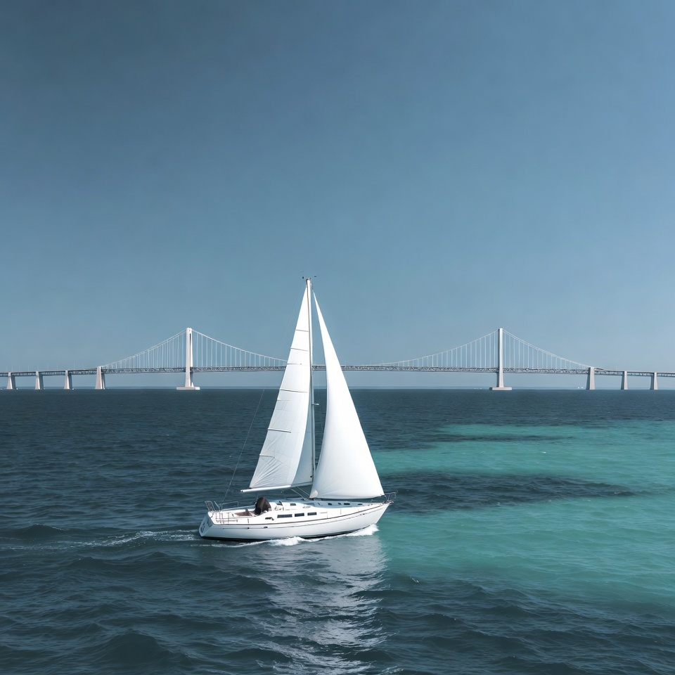 A white sailboat with tall sails glides on turquoise ocean waters. In the background, a large modern suspension bridge spans across the sea under a clear blue sky. The boat is positioned in the foreground with calm waves reflecting the scene.