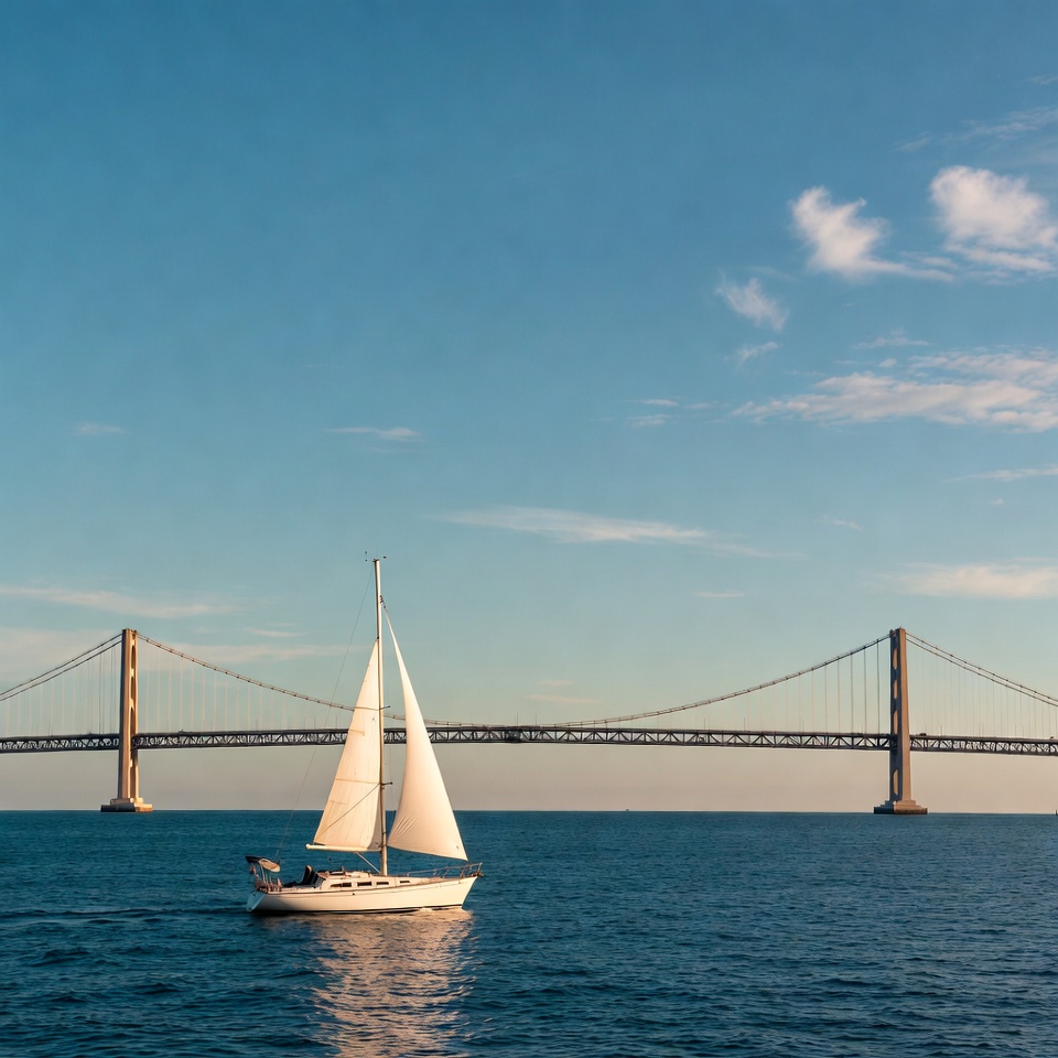 A white sailboat sails on calm ocean waters beneath the iconic Golden Gate Bridge. The bridge's orange towers and suspension cables stand prominently against a clear blue sky with scattered clouds. The boat's sails are fully extended, reflecting on the water surface.