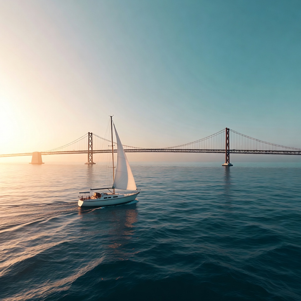 A white sailboat sails on calm ocean waters under the iconic Golden Gate Bridge. The bridge's red-orange towers rise prominently against a clear blue sky during golden hour sunlight. Gentle waves reflect the warm light from the setting sun.