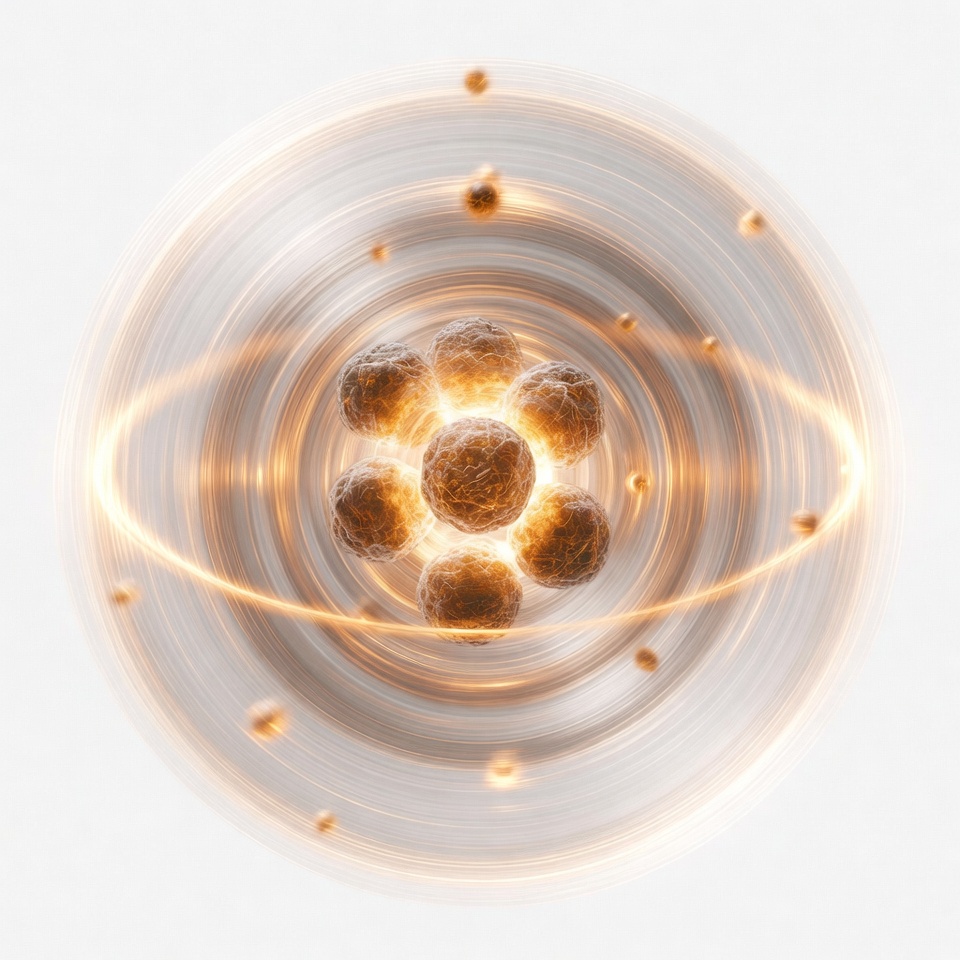 A 3D rendered atomic model features a glowing orange nucleus composed of six clustered spheres at the center. Surrounding the nucleus are multiple rings of orbiting electrons depicted as small golden spheres. The image uses radiant light effects and a white isolated background.