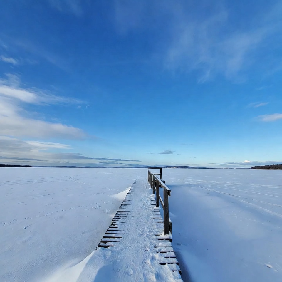 blue sky, clouds, cold weather, distant hills, frozen lake, horizon, ice, icy lake, lake ice, landscape, nature, outdoors, railing, scenic view, snow, snowy pier, white snow, winter, winter scene, wooden pier
