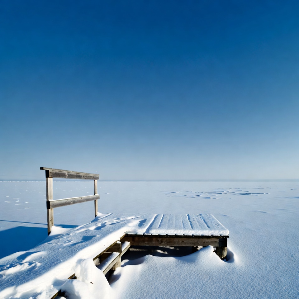 A wooden pier with railings extends over a vast frozen lake covered in snow and ice. Fresh snow blankets the pier's surface and surrounds it against a clear blue sky. The scene shows an isolated dock in a wintery, icy landscape.