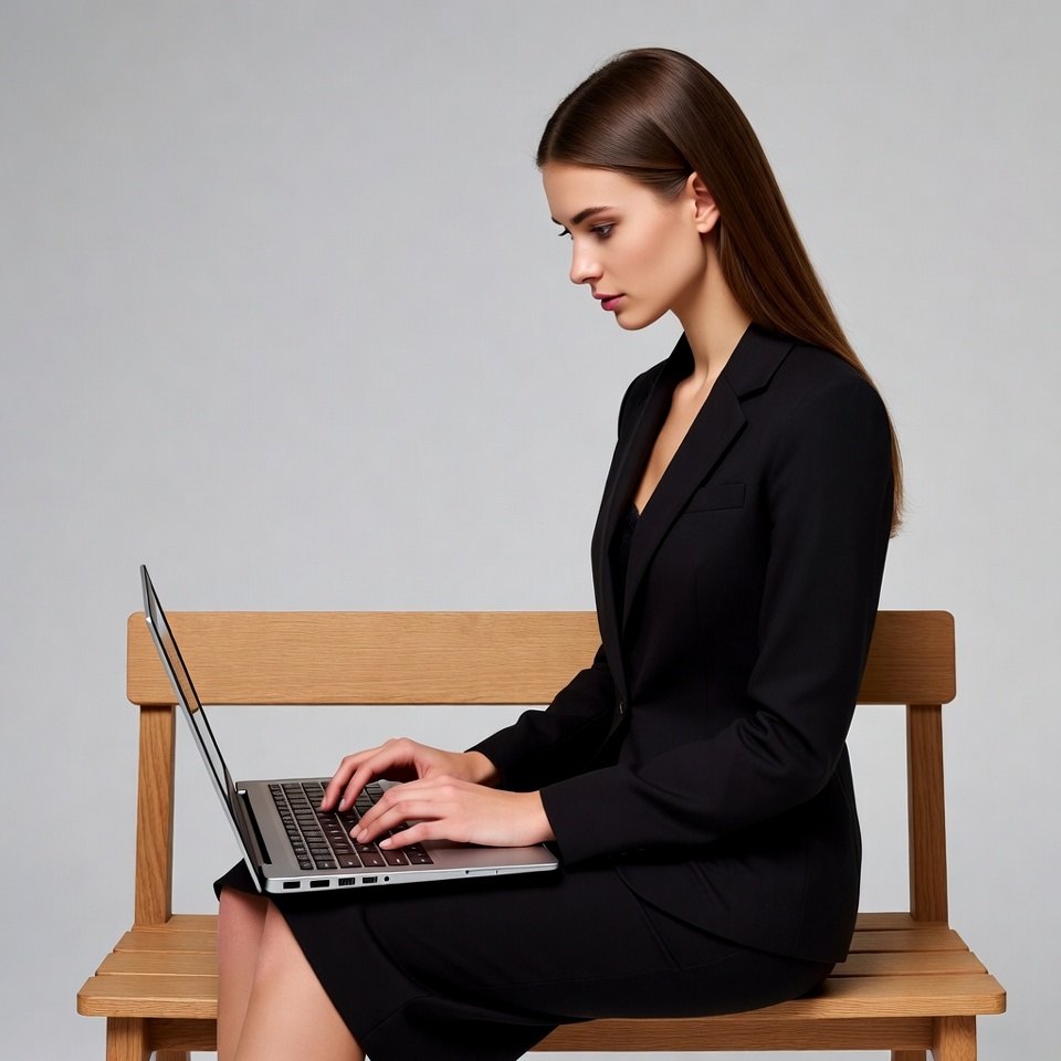 A young woman with long dark hair sits on a wooden bench, typing on a silver laptop. She wears a black blazer and dress suit, viewed from the side in profile. The background is plain white.