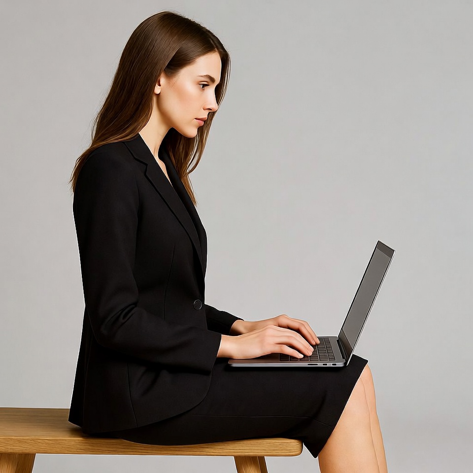A woman with long brown hair sits on a wooden bench typing on a silver laptop. She wears a black blazer and skirt suit, viewed from the side profile. The background is plain gray.