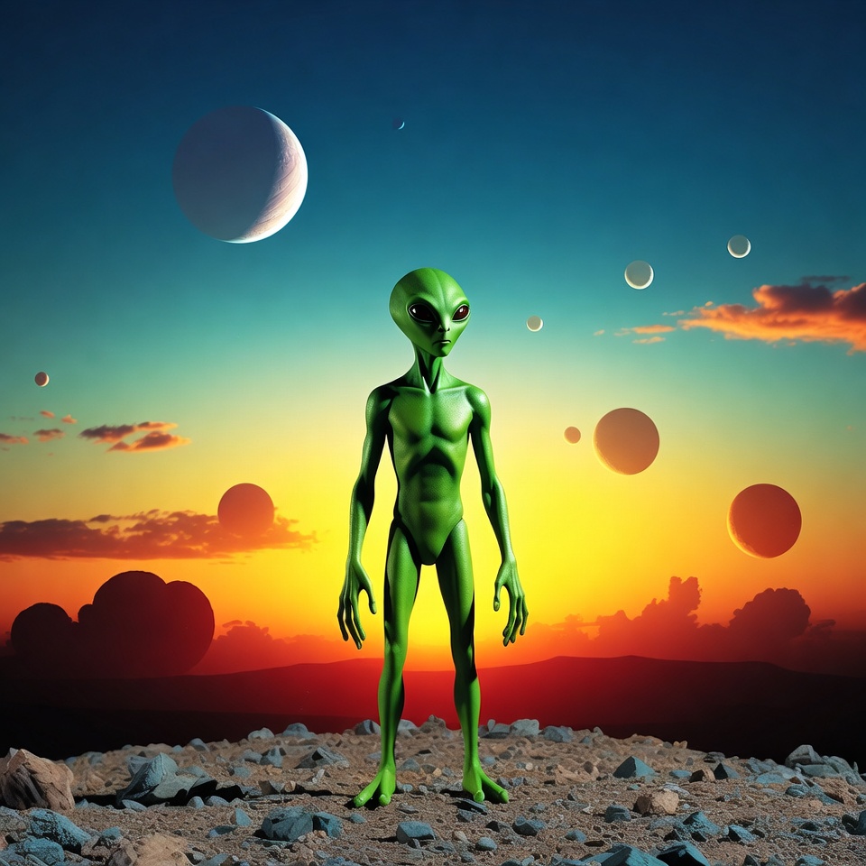 A green-skinned alien with large black eyes and slender body stands on a rocky terrain. Multiple colorful planets float in the cosmic sunset sky behind it. The scene features a vibrant orange and purple horizon with scattered rocks at the base.