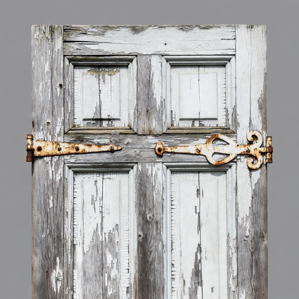 aged wood, antique door, architecture, barn door, chipped paint, distressed door, door hardware, farmhouse door, four panels, gray background, home decor, iron hinges, isolated background, outdoor door, peeling paint, rust, rustic door, rusty hinges, texture, vintage door, weathered door, white door, wood grain, wooden door, old door
