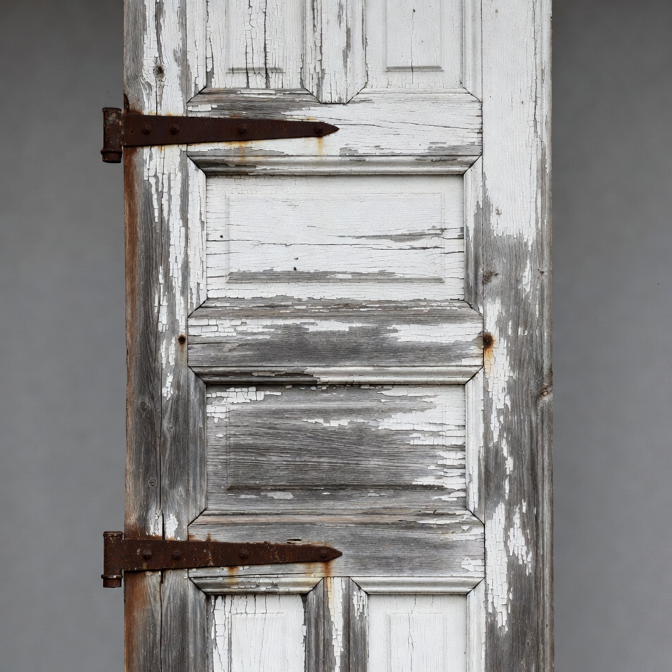aged wood, antique door, architecture, chipped paint, distressed wood, door detail, exterior door, farmhouse door, gray background, iron hinges, old door, paneled door, peeling paint, rusted hinges, rustic door, vintage door, weathered door, white door, wooden door, door