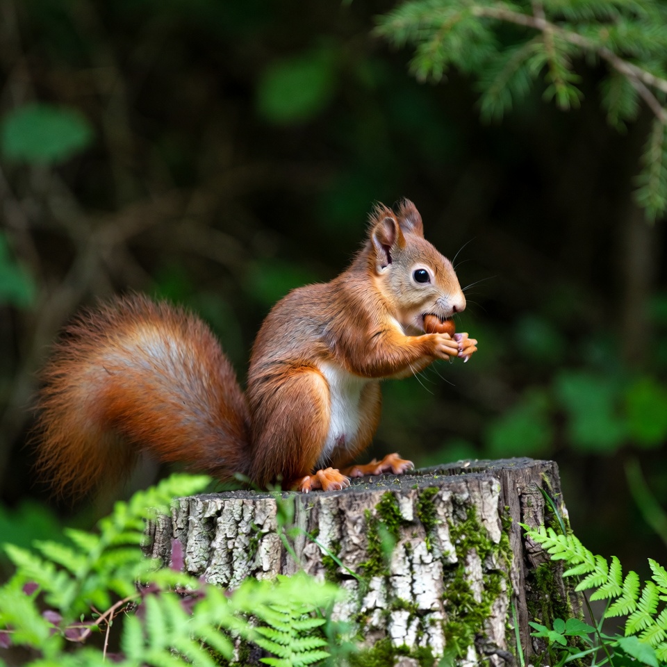 A red squirrel with bushy tail sits on a mossy tree stump in a green forest. It holds and eats a nut with its front paws. Surrounding ferns and foliage create a natural woodland background.