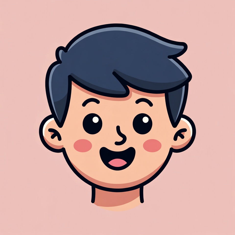 A cute cartoon illustration of a boy with dark blue hair and large expressive eyes smiles widely on a pink background. His cheeks are rosy with blush, and he has a simple line art style. The image features bold outlines and vibrant colors typical of vector clipart.