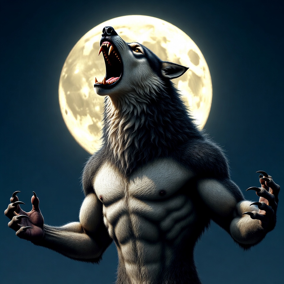 A muscular werewolf with gray fur howls at a large full moon in a dark night sky. It stands on its hind legs with arms outstretched, sharp claws extended, and fangs bared in a fierce roar. The creature's detailed abs and powerful build are highlighted against the blue-black background.