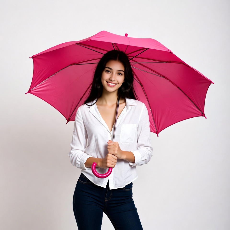 A young Asian woman with long dark hair smiles while holding a large pink umbrella over her head. She wears a white button-up shirt and blue jeans, standing against a plain white background. The umbrella is fully open and vibrant pink.