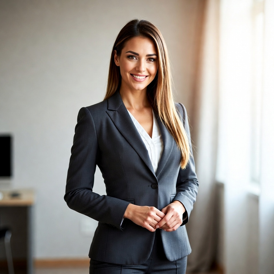 A young woman with long straight brown hair smiles confidently while standing in a modern office. She wears a tailored gray blazer over a white blouse and black pants, with hands clasped in front. The background features large windows, a desk, and a computer monitor.