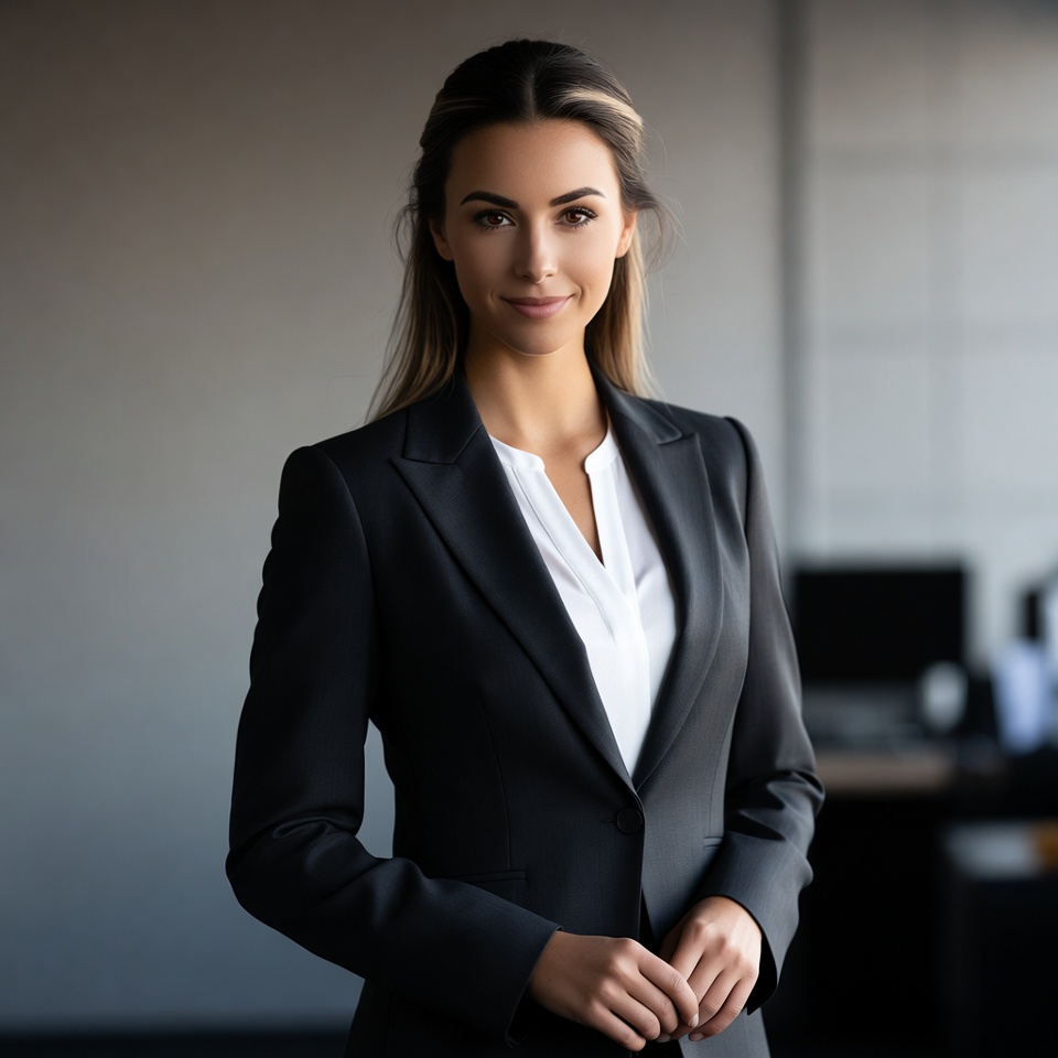 A young woman with long blonde hair stands confidently in a modern office wearing a tailored black blazer and white collared shirt. She smiles slightly with hands clasped in front, positioned against a blurred background of desks and computers. The lighting highlights her poised professional appearance.