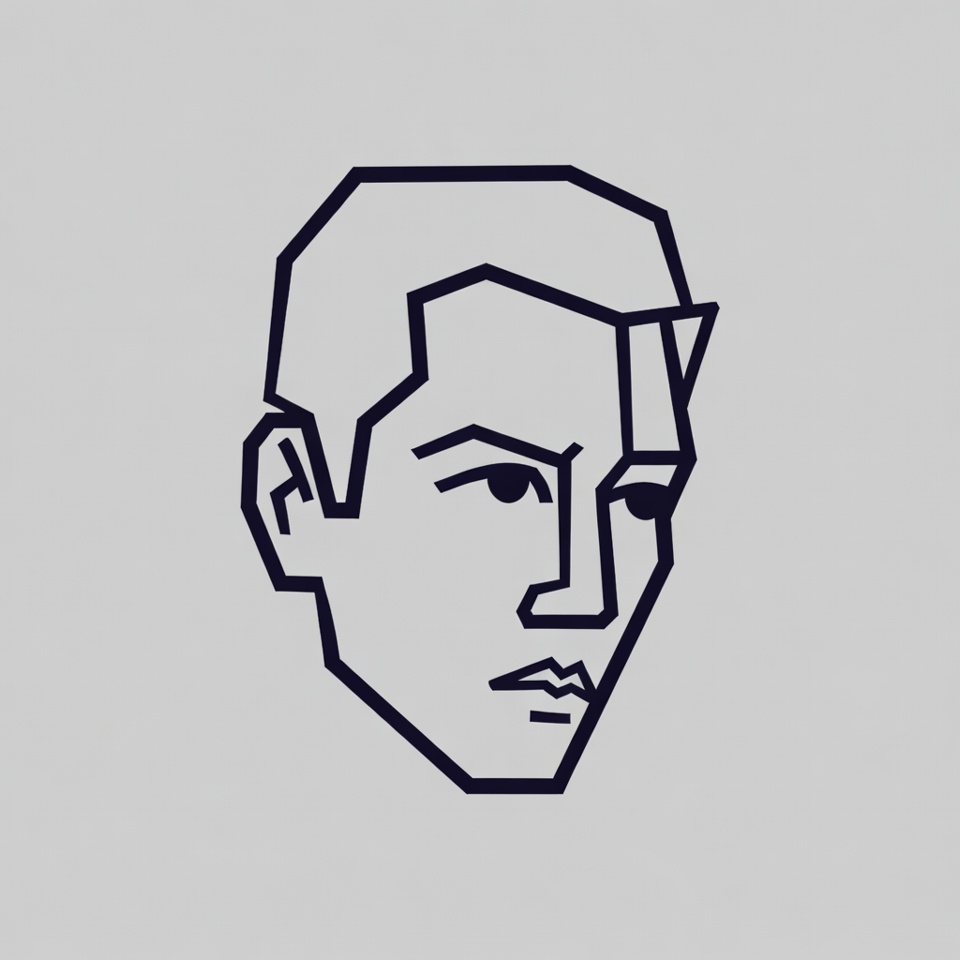 A minimalist geometric illustration of a man's face rendered in thick black outline on a light gray background. The design features sharp angular lines forming the head, hair, eyes, nose, and mouth. It has a modern, abstract style with no shading or color fills.
