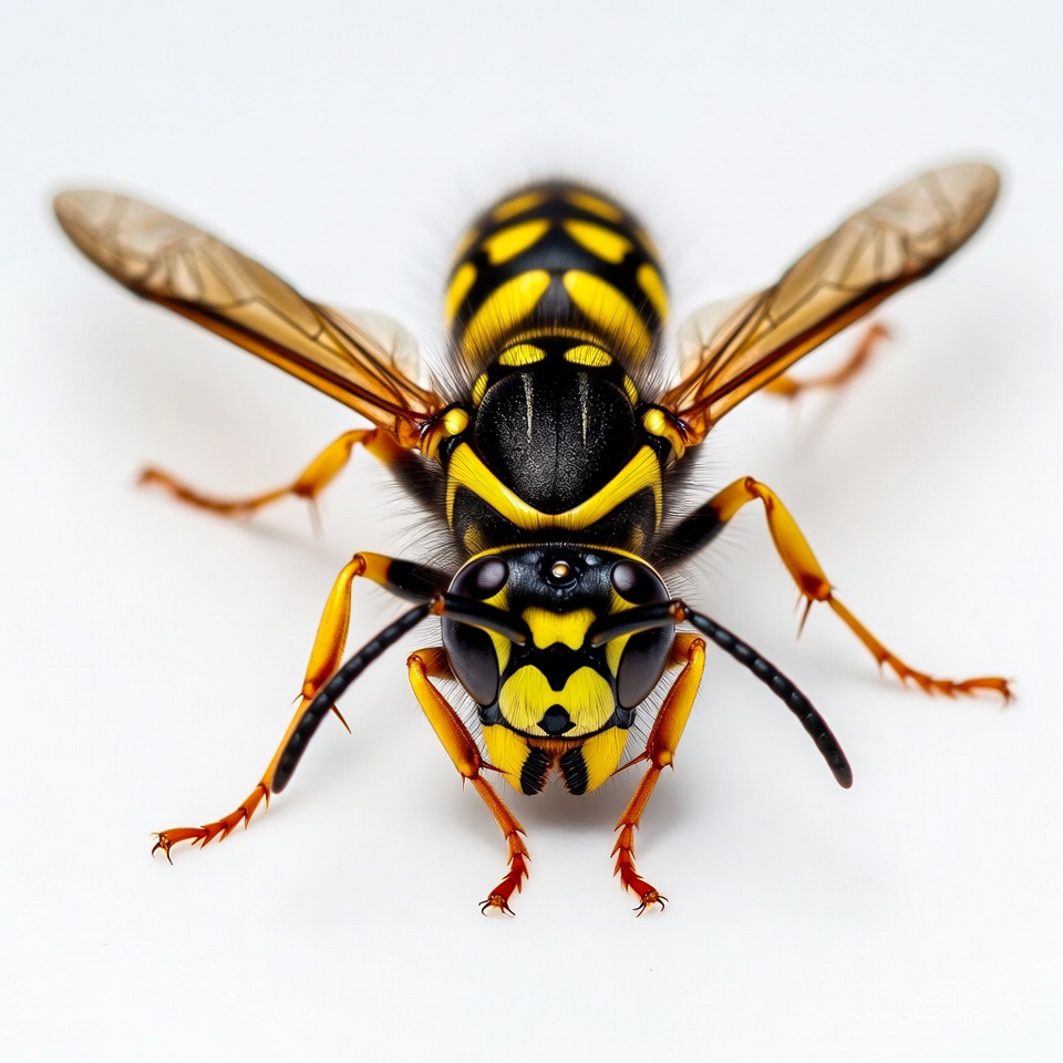 A yellow jacket wasp with black and yellow striped body faces forward on a white background. Its wings are spread open, and detailed legs and antennae are visible. The macro shot highlights the insect's compound eyes and facial markings.
