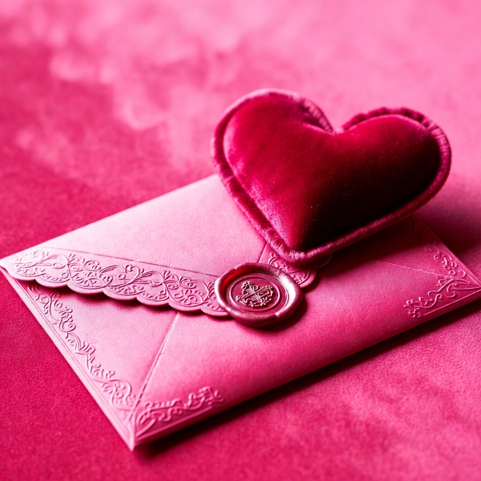 envelope, fabric surface, heart, holiday card, lace edges, love, ornate design, pink background, pink envelope, plush heart, red heart, romantic, romantic gift, sealed letter, soft pink, valentine, valentine's day, velvet heart, wax seal, love letter