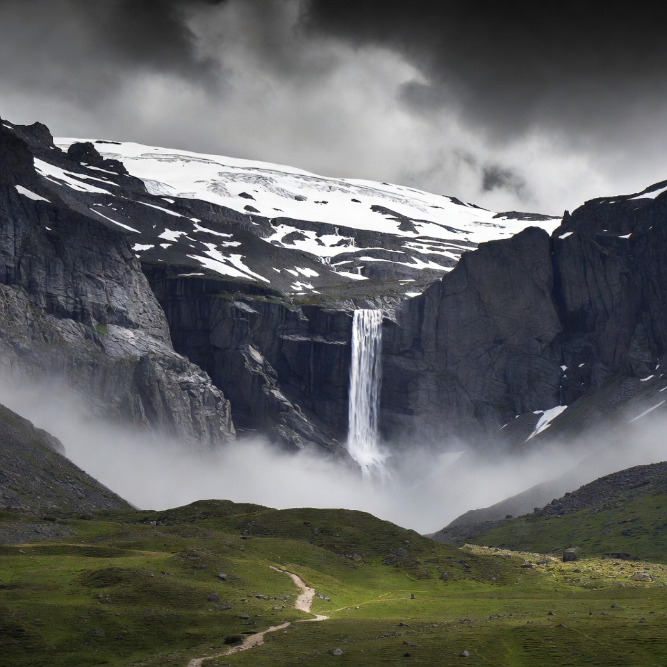 alpine landscape, cascade, cliffs, clouds, dirt path, fog, glacier, green hills, mist, mountains, nature, rocks, rugged terrain, scenery, snowy peaks, storm clouds, valley, waterfall