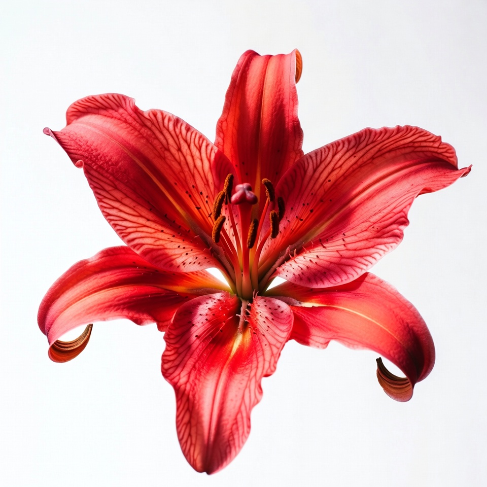 bloom, botany, closeup, floral, flower, isolated, lily, lily flower, nature, petals, red flower, stamen, vibrant, white background, red lily
