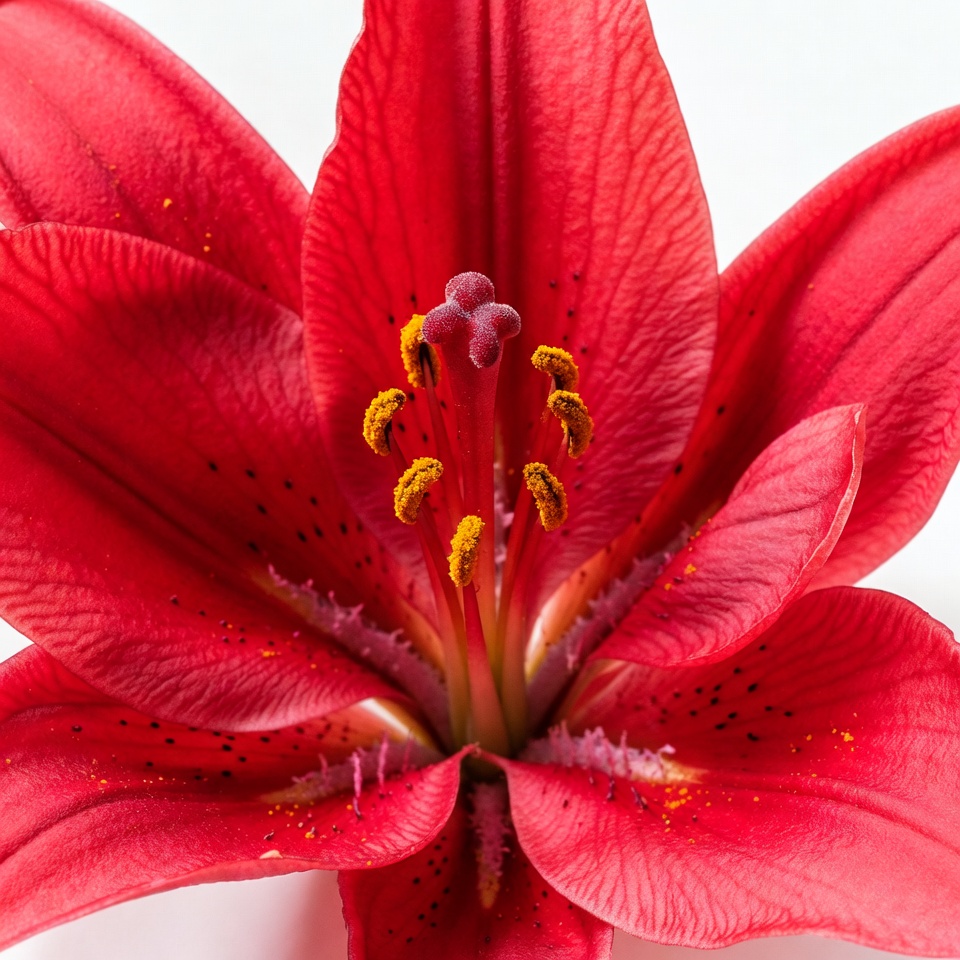 anthers, bloom, floral, flower center, flower closeup, isolated background, lily flower, macro, petals, pollen, red flower, stamens, vibrant red, white background, red lily