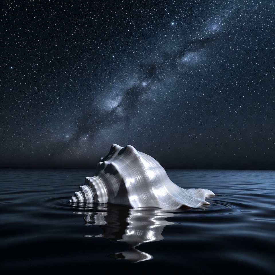 Milky Way, astronomy, calm water, conch shell, cosmic, galaxy, isolated background, marine, night sky, ocean, reflection, sea shell, shell on water, starry sky, stars, water, white shell, seashell