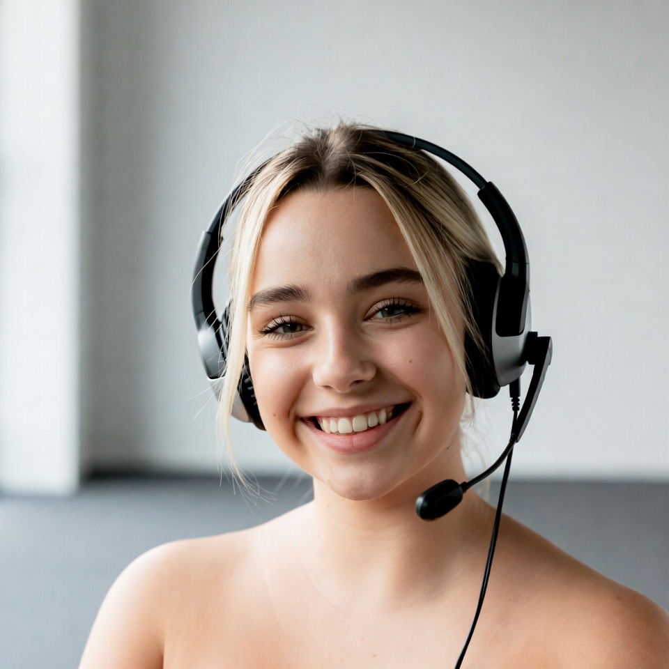 A young blonde woman with shoulder-length hair smiles happily while wearing black over-ear headphones with a microphone. She is topless, showing her bare shoulders and chest, and stands against a plain white indoor background. Her expression is cheerful with bright eyes and an open smile.