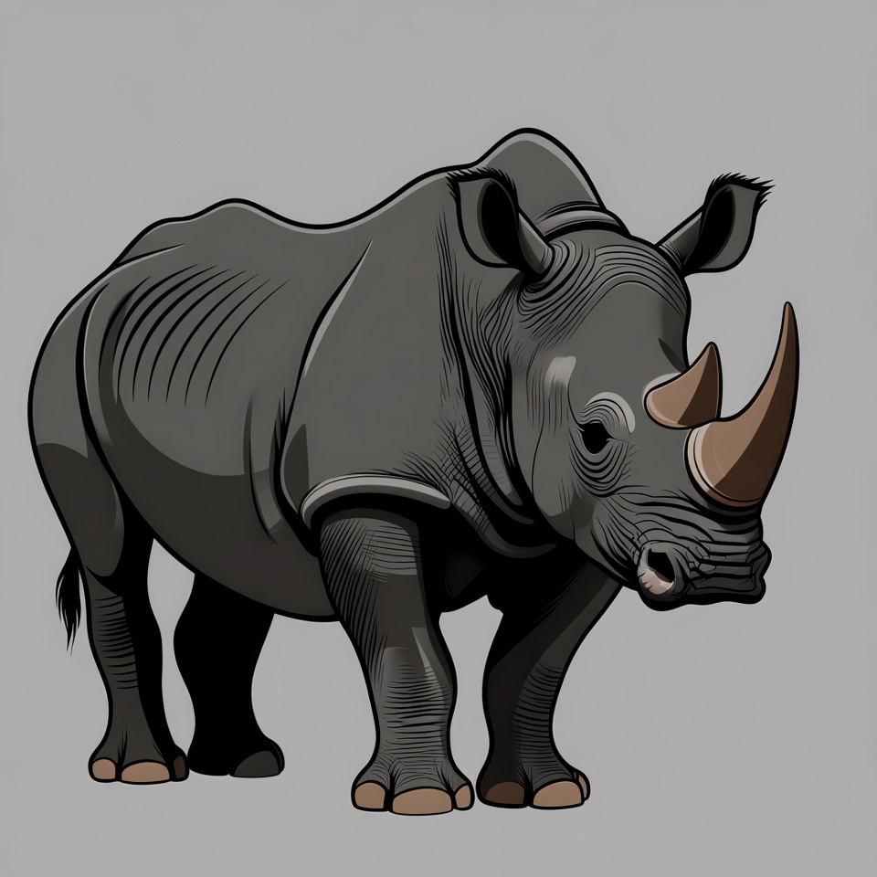 A detailed cartoon illustration of a black rhinoceros stands on a plain gray background. The rhino features a prominent horn, muscular body with textured shading, large ears, and sturdy legs ending in hooves. It faces slightly to the side with a realistic yet stylized appearance.