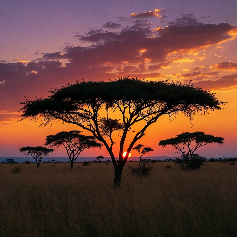 A large acacia tree stands in silhouette against a vibrant purple and orange sunset sky. The sun is low on the horizon, casting golden rays over a grassy savanna plain. Several smaller acacia trees dot the expansive landscape in the background.