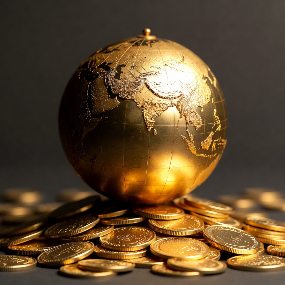A shiny golden globe sits atop a pile of gold coins against a dark background. The globe features detailed metallic continents and oceans with a reflective surface. Numerous gold coins are stacked and scattered around the base.