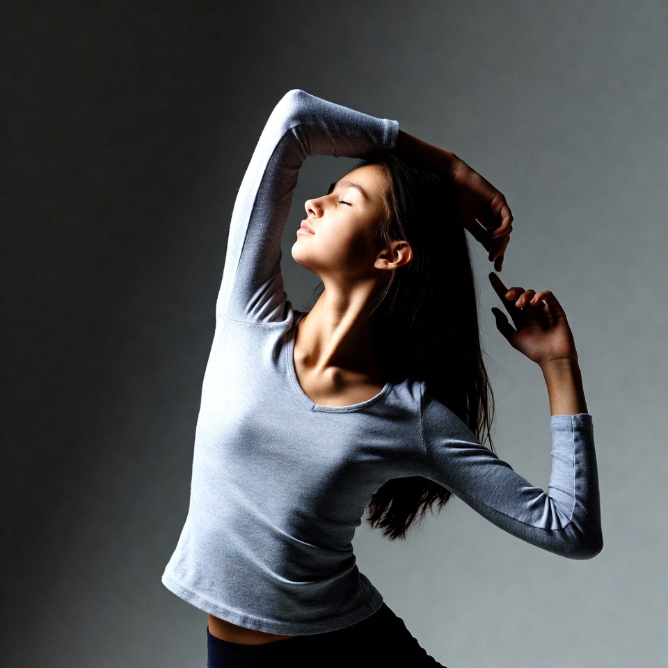 A young Asian woman with long dark hair performs a graceful dance pose against a gray background. She wears a fitted gray long-sleeve top and dark leggings, with one arm raised elegantly above her head and her neck arched back. Her eyes are closed in concentration, and her body leans sideways in a dynamic stretch.