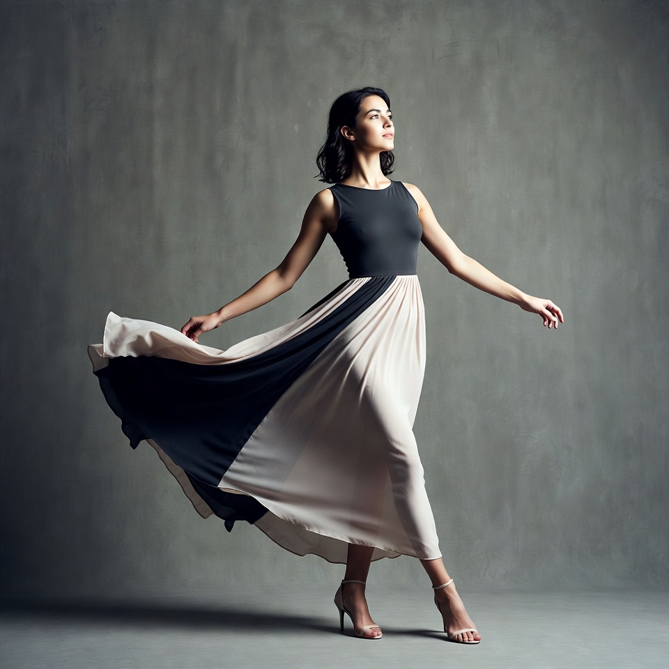 A woman with shoulder-length dark hair stands in a dynamic pose on a gray background, wearing a sleeveless black and white maxi dress with a flowing skirt. She extends her arms gracefully as the skirt billows around her legs. She wears high-heeled sandals and looks upward with a subtle expression.