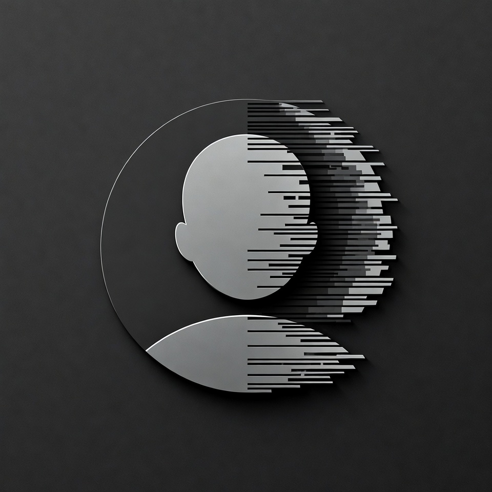 A minimalist grayscale illustration of a human head in profile view, split into a smooth white half and a textured black half with vertical streaks. The design is circular and isolated on a dark background. It features sharp, modern geometric lines.