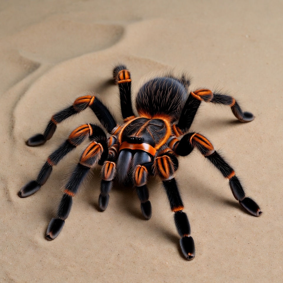 arachnid, arthropod, black fur, eight legs, exotic pet, fangs, hairy legs, isolated, macro photography, orange baboon tarantula, orange markings, sand background, spider, wildlife, tarantula