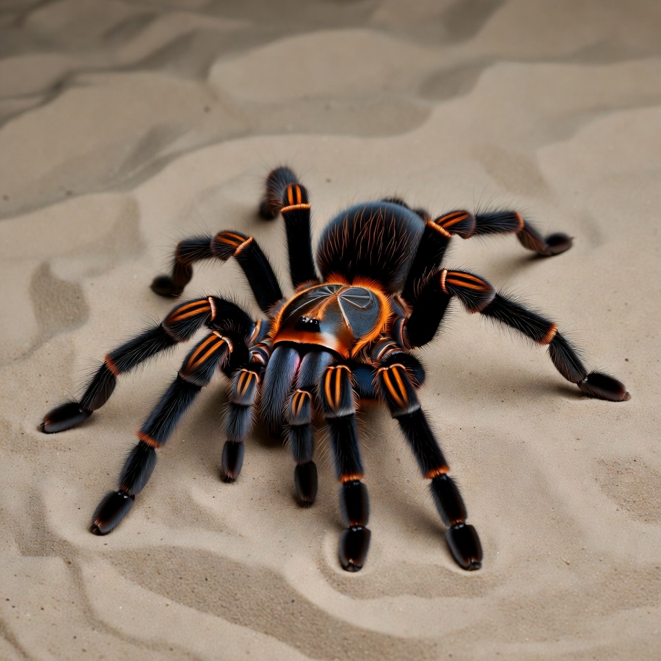 A vibrant orange baboon tarantula with striking black and orange striped legs stands on a sandy surface. Its furry body features bold orange markings and a metallic blue sheen on the carapace. The spider is posed with legs extended, showcasing its detailed hairy texture.