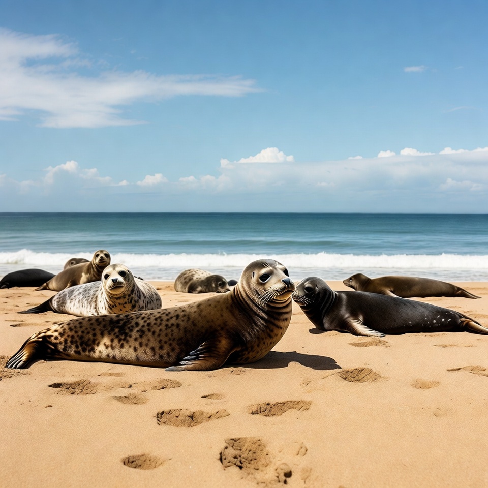 Harbor Seals Lounging on Beach