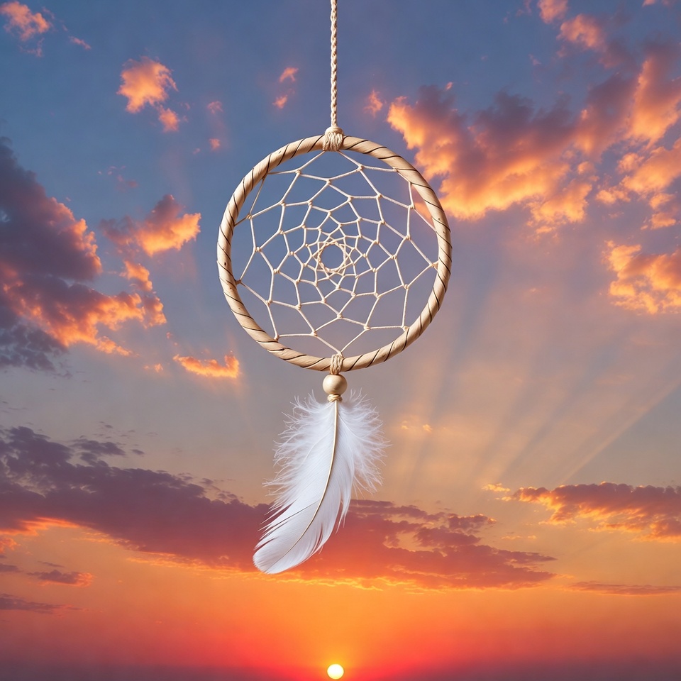 A traditional dreamcatcher with a woven web and white feathers hangs from a string against a vibrant sunset sky. Golden sunlight rays shine through the clouds of orange, pink, and blue hues. The dreamcatcher is centered prominently in the image with a glowing sun below.