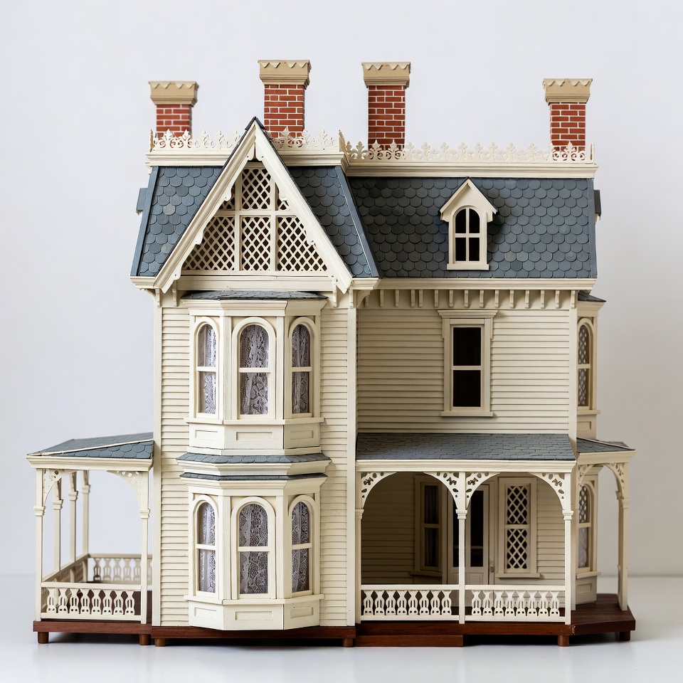 Victorian house, architecture, bay windows, beige siding, brick chimneys, chimneys, doll house, gables, gray roof, isolated, miniature house, model house, ornate details, porch, railing, slate roof, toy house, white background, dollhouse