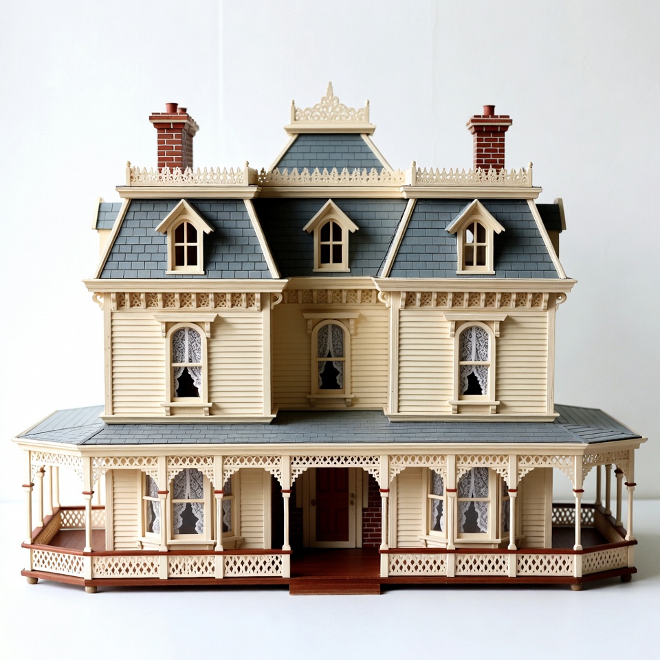 Victorian mansion, architecture model, beige walls, blue roof, chimneys, detailed miniature, doll house, gabled windows, isolated background, miniature house, ornate dollhouse, porch, railings, scale model, toy house, dollhouse