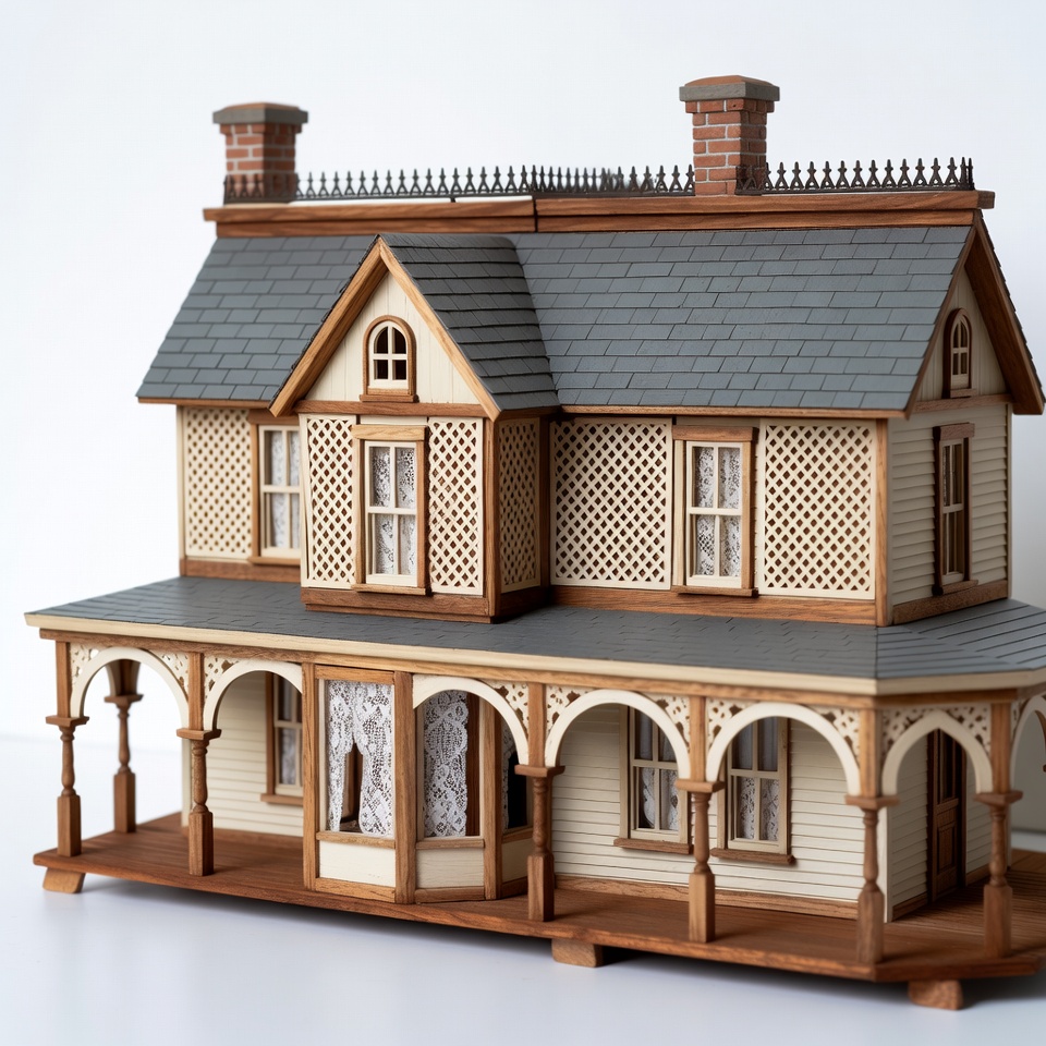 Victorian house, architecture model, beige siding, brown trim, chimneys, detailed craftsmanship, doll house, gray roof, isolated background, latticework, miniature model, model home, toy house, white curtains, windows, wooden dollhouse, wraparound porch, dollhouse