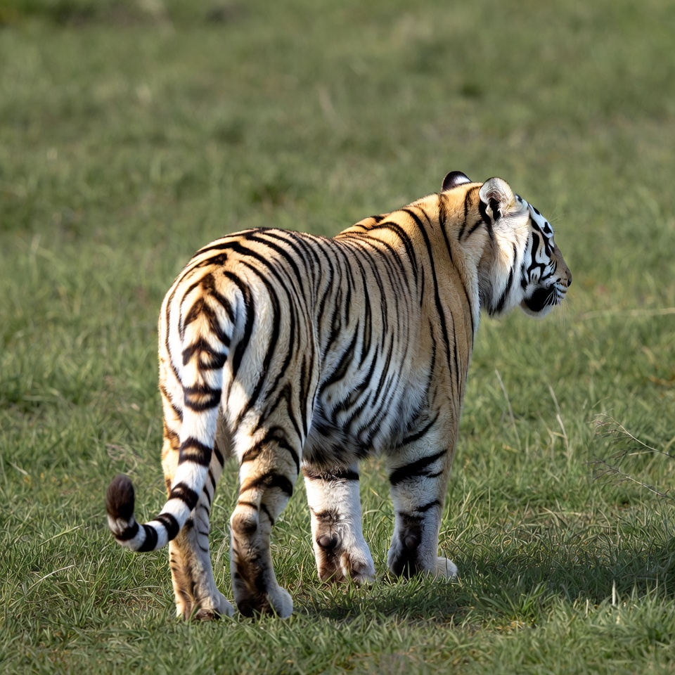 animal portrait, big cat, black stripes, grass field, green grass, nature, orange fur, paws, predator, rear view, side view, stripes, tail, walking tiger, wild animal, wildlife, tiger
