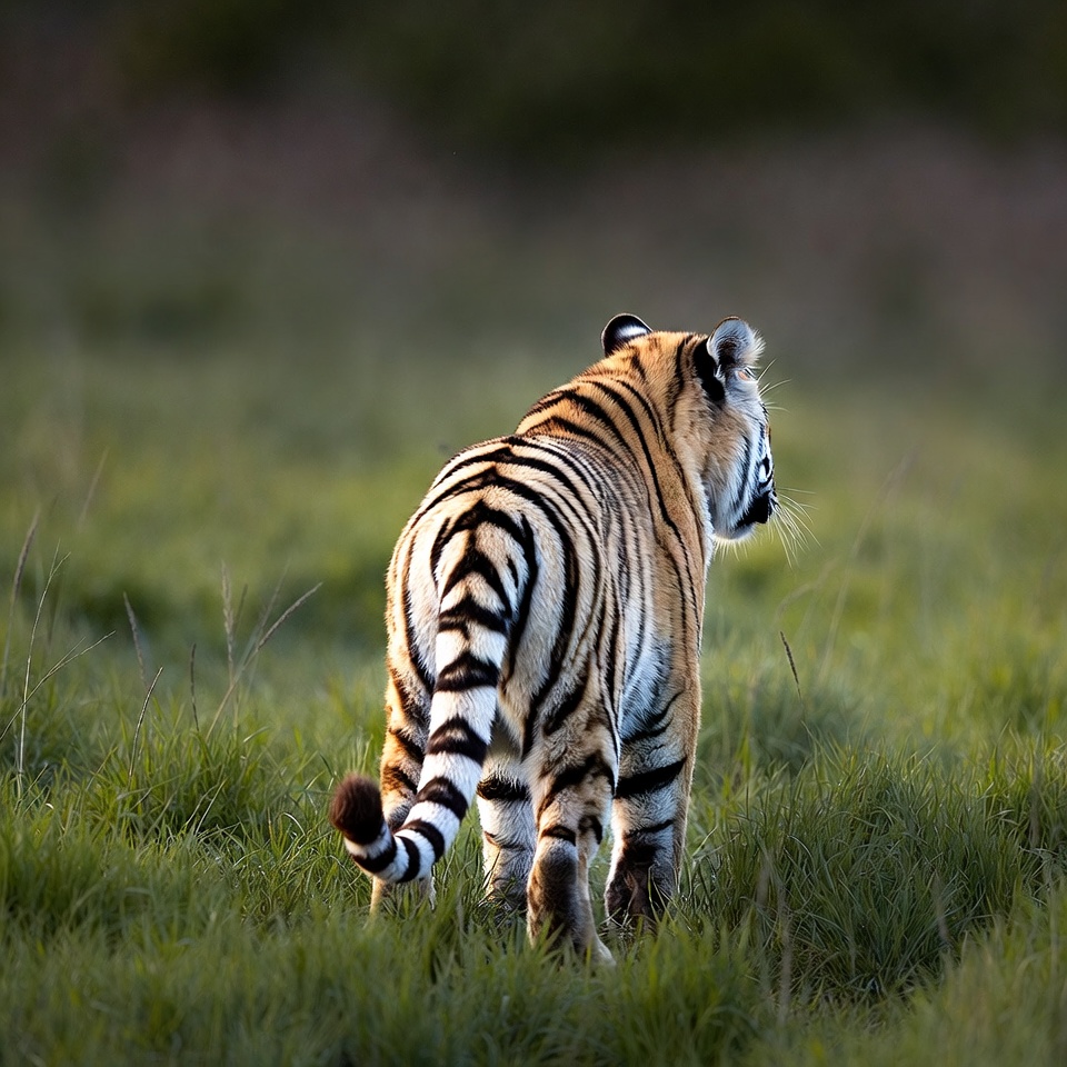 animal, big cat, black stripes, field, grass field, green grass, nature, orange tiger, outdoors, rear view, striped tiger, tall grass, tiger back, tiger tail, tiger walking, walking tiger, wildlife, tiger