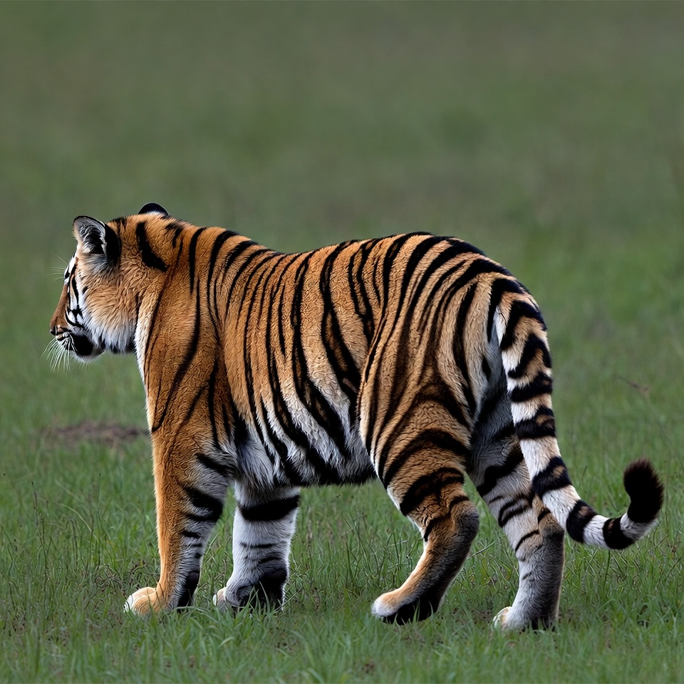 animal portrait, big cat, black stripes, grass field, green grass, nature, orange tiger, paws, predator, side view, striped fur, tiger tail, walking tiger, wild animal, wildlife, tiger